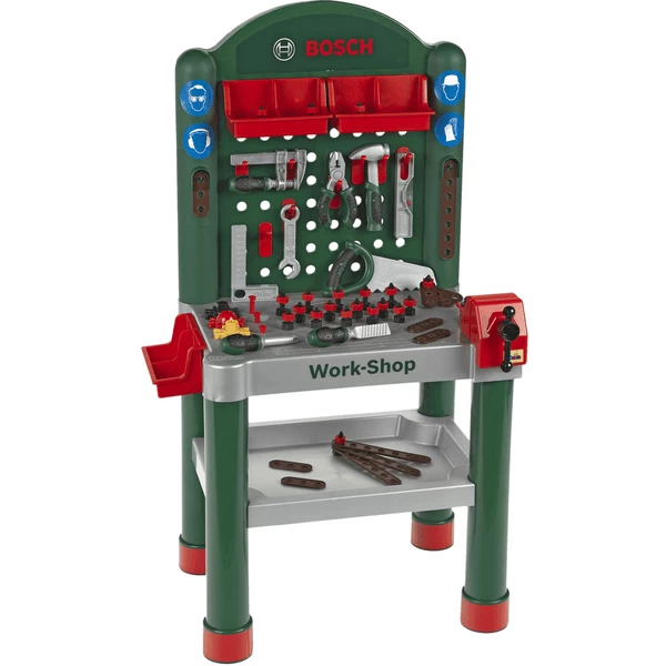 - Inhalt: Werkbank, Arbeitsplatte mit Lernfunktion, Schraubstock, Handsäge, Hammer, Schraubendreher, Schraubenschlüssel, Wasserwaage, Zange, Feile, Winkel, Spanner, 3 Ablagekästen, zahlreiche Schrauben, Muttern, Dübel und Latten